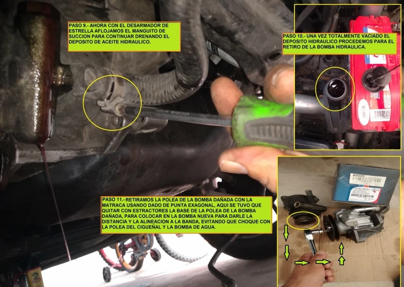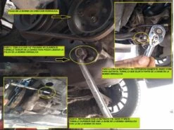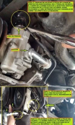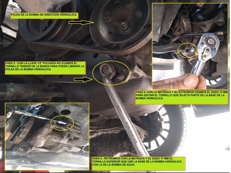 Paso 14.- Colocamos la banda sobre la polea del cigüeñal, también la banda de la bomba hidráulica y usando la matraca con el dado 10 mm ajustamos el recorrido con el tornillo y damos la tensión necesaria a la banda de la bomba.