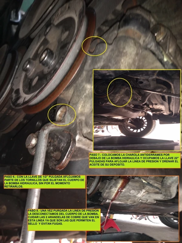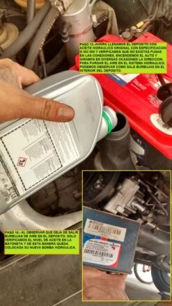 Paso 15.- Ahora llenamos el deposito con aceite hidráulico original con la especificación mencionada, verificando que no existan escurrimientos en los conectores,encendemos el motor y giramos en diversas ocasiones la dirección del auto, para poder purgar el aire en todo el sistema hidráulico, se puede visualizar en el fondo del deposito deja de salir burbujas.