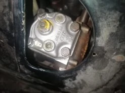 para extraer la vieja caja, primero hay que desmontar el tanque de gasolina tomando las precauciones que esto conlleva. Se levanta el puente con el gato y se traba el volante para que no gire. La caja está sujeta con una abrazadera en uno de los tubos del puente, se aflojan y a continuación se separa de la columna de dirección.