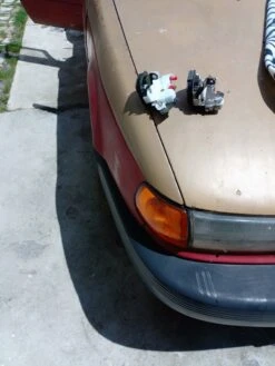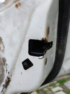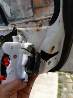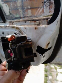 - Ya que desmontaste la puerta retira el tornillo que sujeta la manija interior para poder retirarla. Verás una grapa que sirve de guía a dos varillas de apertura. Esta grapa se abre para que queden sueltas las varillas y una vez flojas se quita el segundo mecanismo que se encuentra al final de estas varillas.