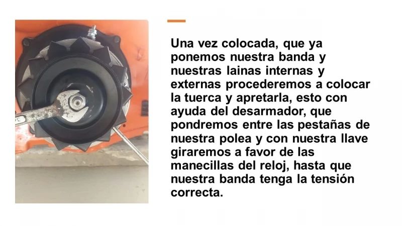 7. Una vez hecho esto vamos a enroscar nuestra tuerca a manera que la banda quede con tensión adecuada y con esto finalizaríamos el cambio de nuestra polea